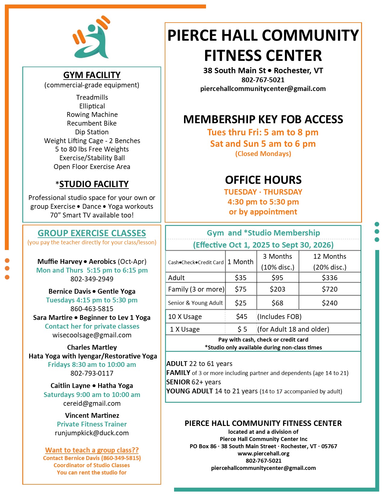 We’re looking for group fitness teachers and one-on-one trainers. You can inexpensively rent the Dance/Yoga/Exercise studio and gym for either $5/class/session if you have your own liability insurance or $6/class/session if sponsored by the Pierce Hall Community Fitness Center. Click here for a link to the Teacher Contract and contact us for further information.